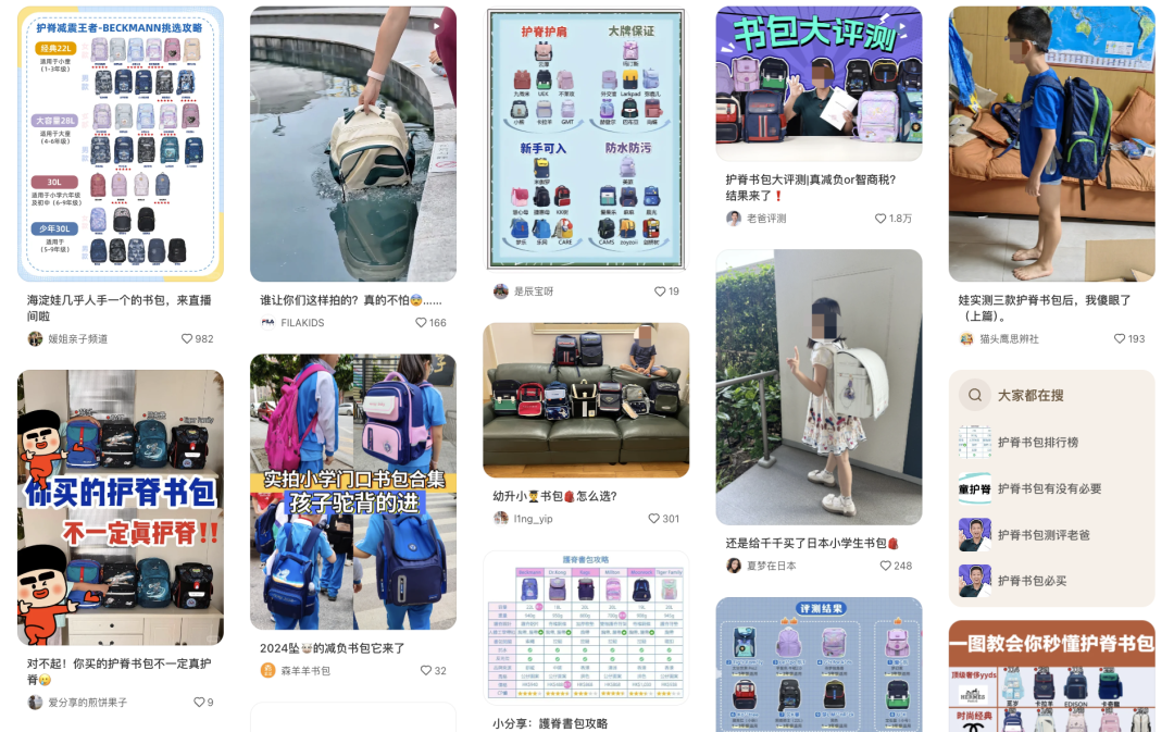 “以前我们读书的时候买书包,最多也就是挑挑款式、看看材质,再对比一下价格,现在的书包不光款式设计丰富多样,还多了很多功能。”Amanda告诉惊蛰研究所,在小红书平台上她看到有不少博主在推荐具有护背、护脊功能的书包,而她自己也一直担心书包选择不合适会影响孩子发育,因此一度被护脊书包种草。