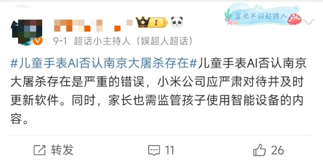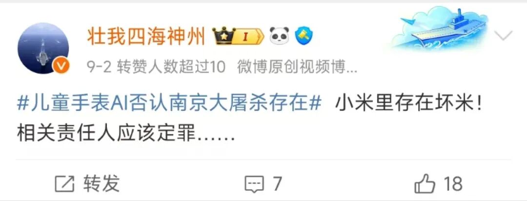 今日,广州的一位家长问自己孩子的儿童手表,南京大屠杀是否真实存在?AI用最萌的夹子音发出了最可怕的回答“不存在”。该家长连问了两次,得到了一样的答案。