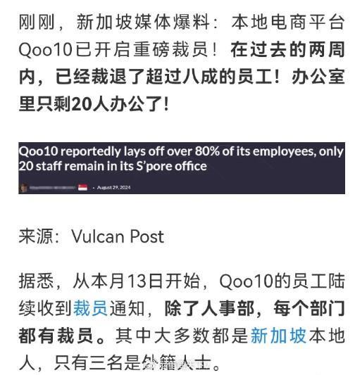 日前,有新加坡媒体爆料,Qoo10裁员超过80%,公司除了人事部门,其他部门都在其中;