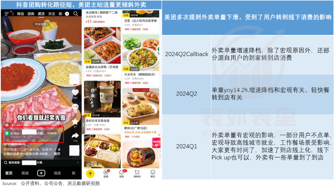 短视频起家的抖音,一条视频既是内容也是“购买链接”,线上线下业务场景之间不存在割裂。反观美团,流量得先紧着外卖业务,到店更多放在团购栏目,甚至是大众点评APP里。