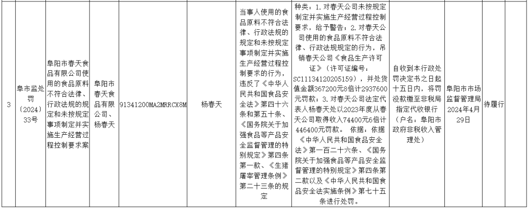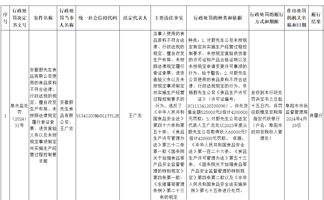 和一同曝光的安徽厨先生食品有限公司、阜阳市春天食品有限公司,累计行政处罚达到了1287.2万元。