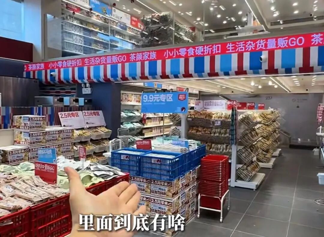 该概念店以“硬折扣,量贩GO”为主题,主打低价优惠,内设多处“2.5元专区”“9.9元专区”,涉及茶叶茶粉、零食、生活杂货及文具潮玩等多个品类,商品以自有品牌为主。