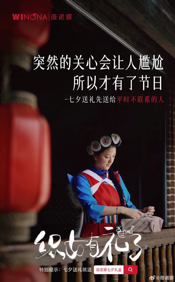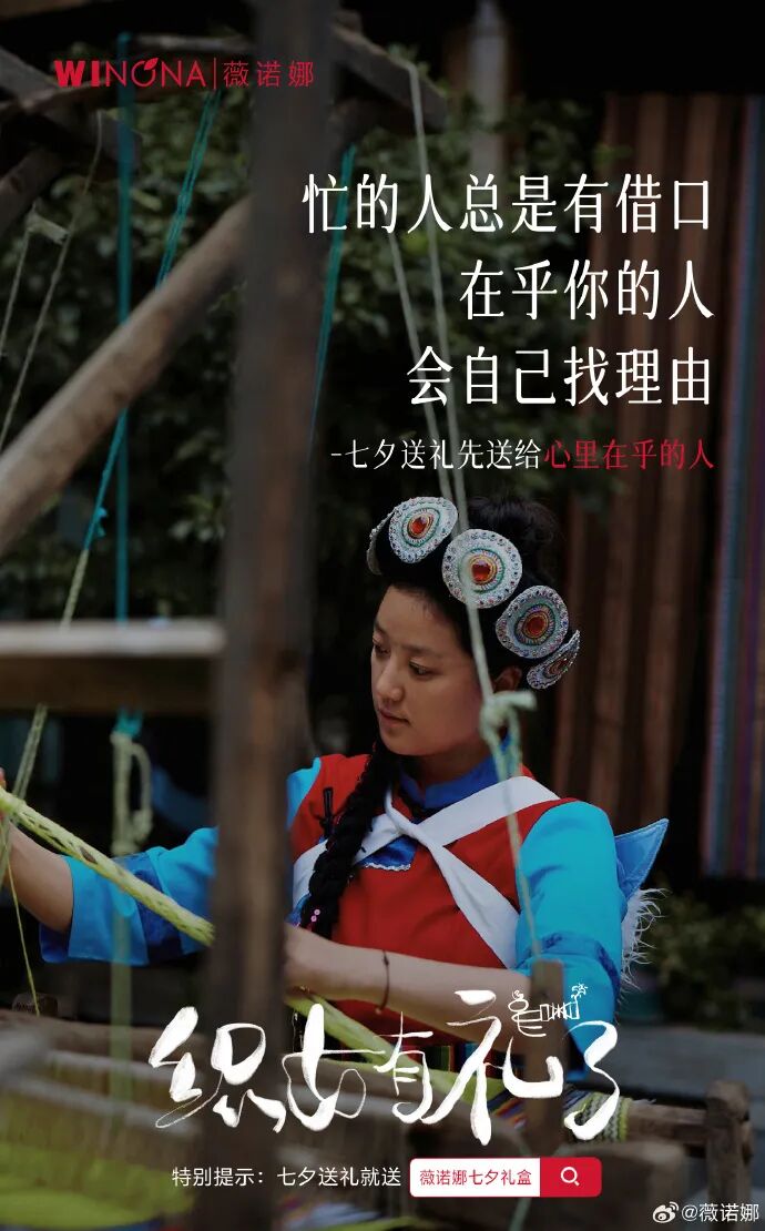 除此之外,薇诺娜将大自然的美好与织女心意结合拍摄短片《织女的礼物》,借助一代代纳西族唱着织女的歌,编织着对天地的祝福,类比为好比两个心意相同的人,用有心意的礼物送给在乎的人,说出彼此的心意。