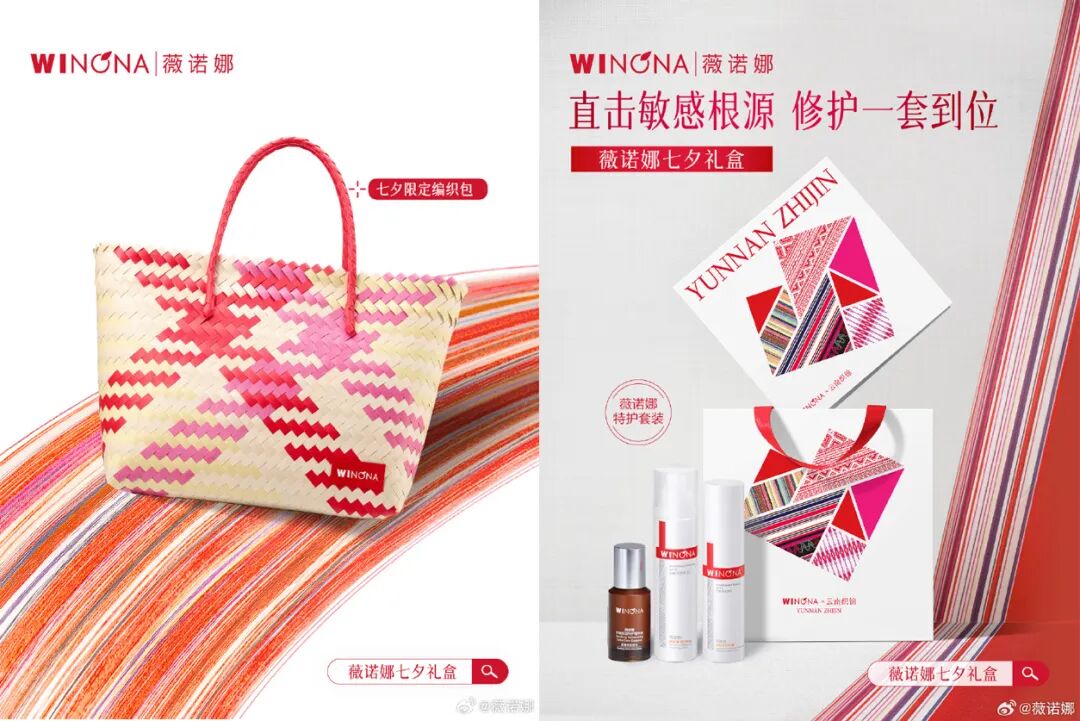 把时间拉到今年七夕,薇诺娜洞察云南少数民族女性特有的织棉生活方式,以云南丽江纳西族《东巴经》的「天女织锦缎」为灵感,推出七夕限定编织包和代表织女心意的「薇诺娜七夕礼盒」。让织女的礼物成为生活里的一份治愈,让每个人有机会送给自己在乎的人。