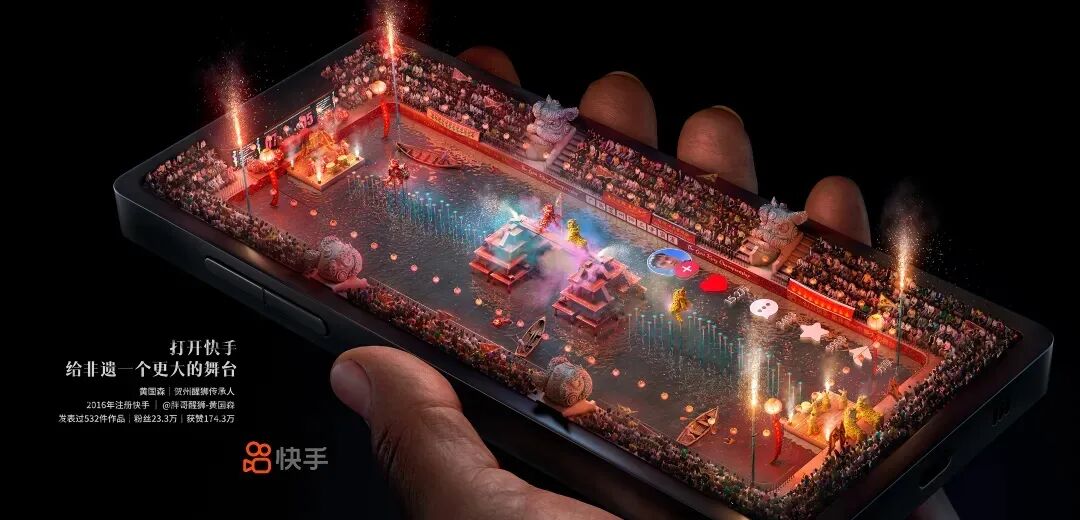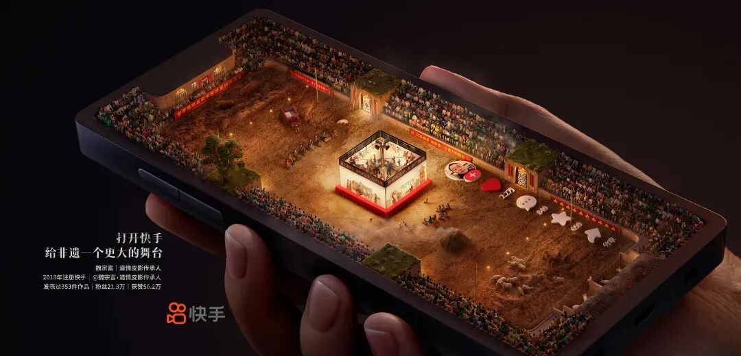 在寓意的表达上,快手以“手”为故事主角,以“手”作为依托,传达出三种寓意——快手的手、手机的手、手艺的手;而快手的手,撑起手机的手和传承非遗文化的手。