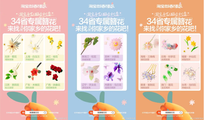 淘宝借助一场全民戴花的春日活动,一方面展开圈层化沟通落地地域营销,基于定制34省的专属簪花,让每个人都可以找到自己家乡专属花花,对家乡产生文化认同感和圈层归属感;
