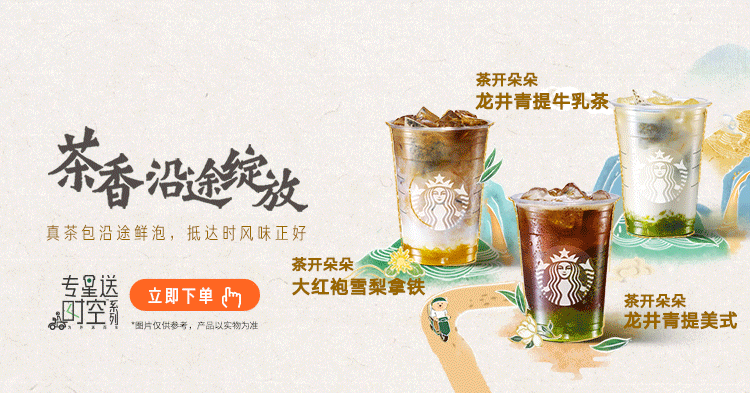 当茶、果与咖在沿途擦出火花,将绽放出怎样的美妙风味呢?正值星巴克专星送上线六周年之际,专星送时空系列™ 再推力作——茶开朵朵系列,利用送达途中的点滴时光,浸泡萃取原液茶包的独特风味,让美味在时空中氤氲绽放,送达消费者手中时正好处于赏味期。