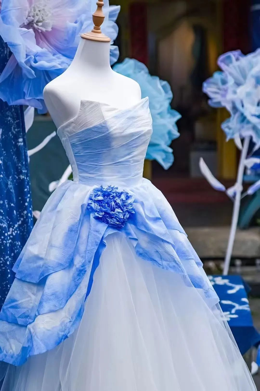 历经浸染、漂洗、晾晒三道工序的维达纸张,呈现出独一无二的蓝白图案,变身成为浪漫的纸巾婚纱作品,定制专属中国女孩的“高定”。