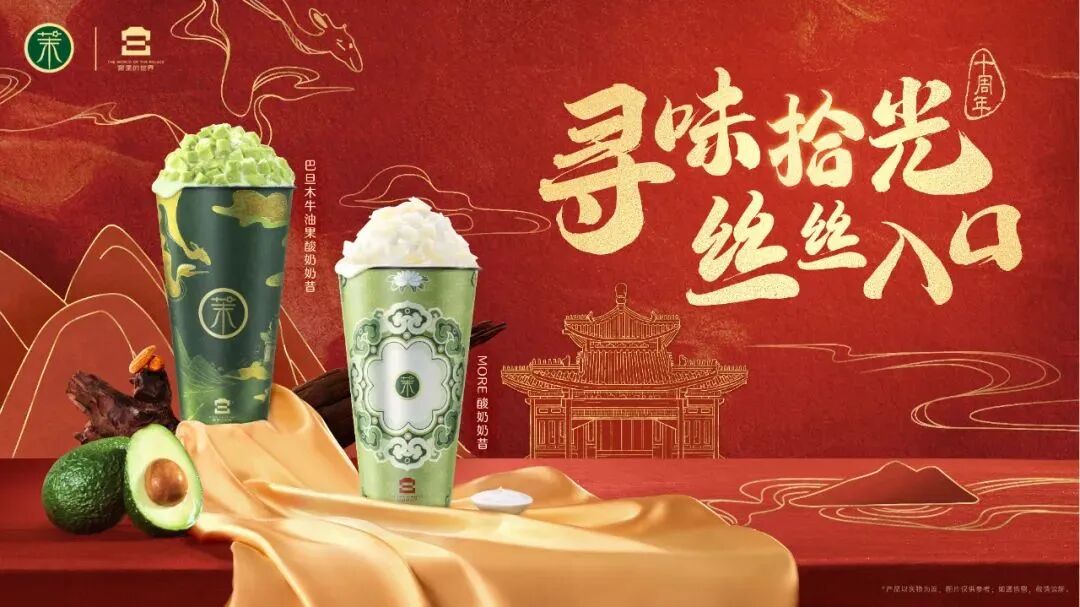 茉酸奶在品牌十周年之际,携手「宫里的世界」IP跨界合作,共同推出“宫廷文化丝绸”系列联名饮品及一系列宫廷丝绸文化周边产品。