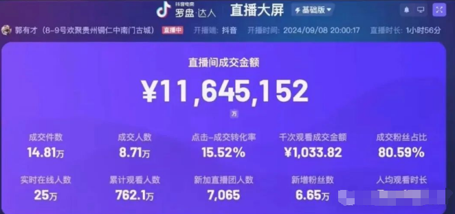 相关数据显示,郭有才直播带货40分钟,热度冲到了带货榜前三,销售额突破千万。整场直播最终持续了近两小时,累计观看人数762.1万,GMV达到1164.5万,还涨了6.65万粉丝。