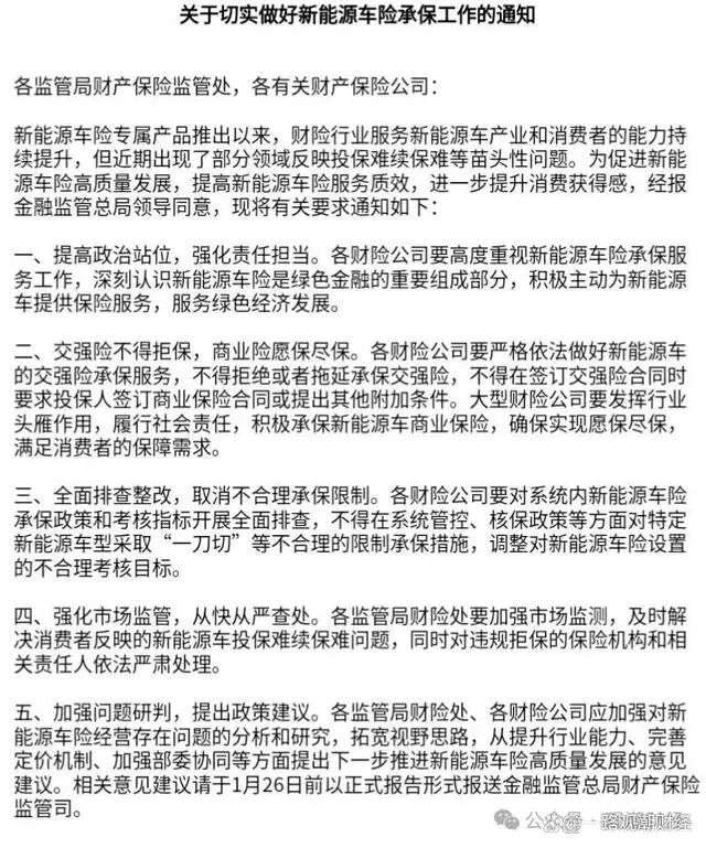 《通知》要求,各财险公司要高度重视新能源车险承保服务工作,重申交强险不得拒保,商业险“愿保尽保”。