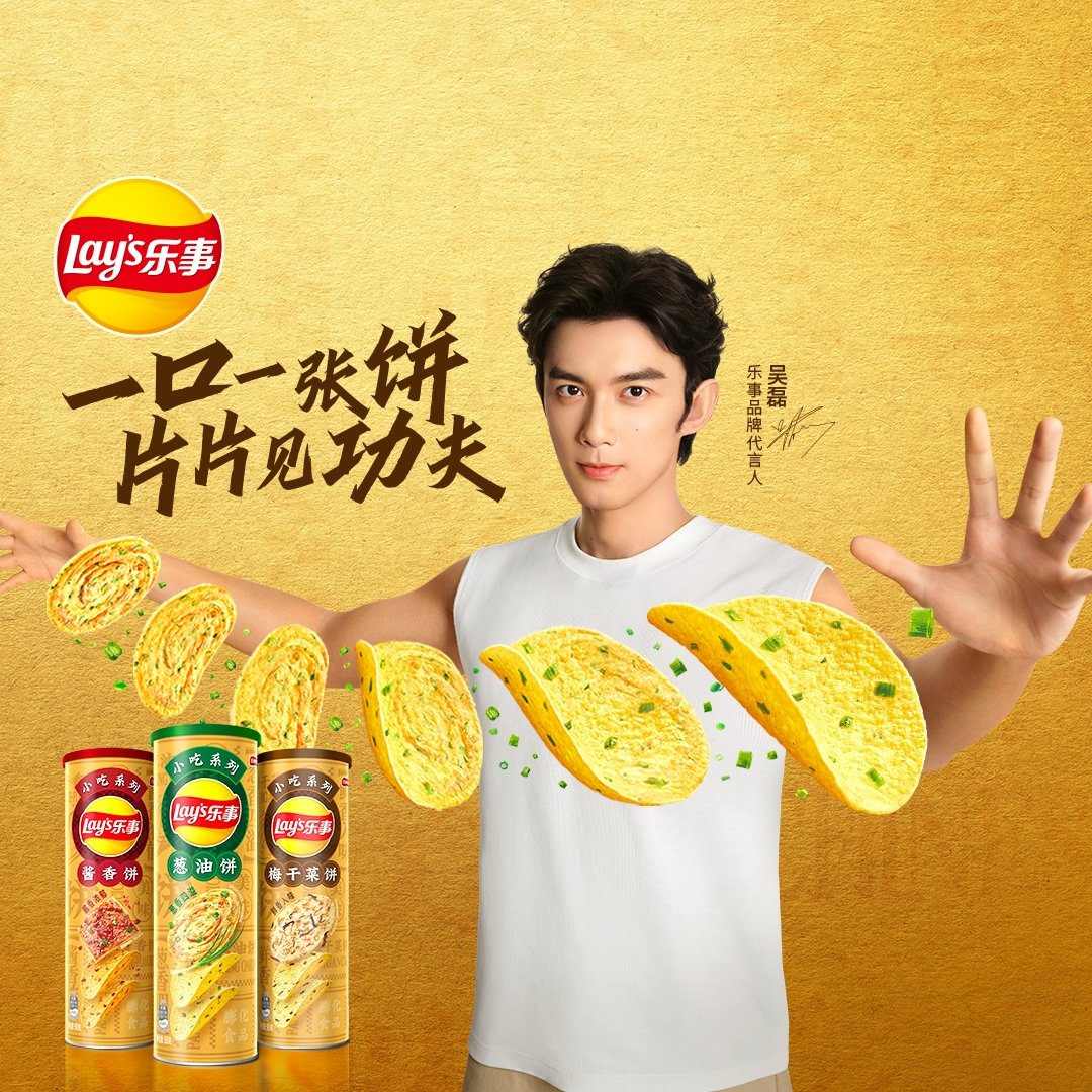 9 月 17 日,乐事官宣吴磊为全新品牌代言人并同步宣传品牌全新上市的「乐事小吃系列」。据悉,全新「乐事小吃系列」薯片将率先推出葱油饼、梅干菜饼、酱香饼三种风味,用正宗给的调味和手法还原一口一片的街头美味。