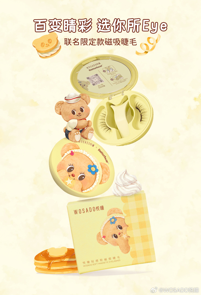 美妆新锐品牌 WOSADO 悦瞳携手软萌可爱的黄油小熊带来「贴贴高手」联名系列,将小熊的元气能量融入灵感磁场,予用户贴心妆点,点亮「睛」彩每一天。此次联名共有小熊睫 | 曲奇黑、情人睫 | 冷雾黑、韩系睫 | 梨花黑 3 个联名款可选,同时二者带来定制周边,玩转无限萌趣,邀请大家快乐上眼,温暖贴贴。