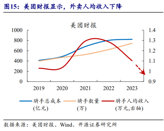 开源证券研报显示,2019年至2023年,美团骑手人均收入经历了先升后降的过程,其中2022年以来骑手人均收入持续下降。《2023工猫零工经济解读报告》中提到,2023年骑手收入下降了25.93%。