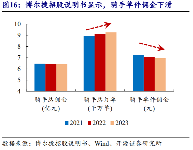 公司披露的招股书显示,2021年至2023年,博尔捷支付骑手的佣金由6.47亿元降至6.43亿元。而同一时间区间下公司骑手承担的配送任务则从0.89亿个增加至0.93亿个。