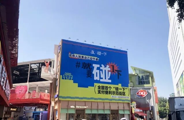 据商家测试数据,61%的年轻人用过一次“碰一下”就会连续用。而作为年轻人聚集、有着成都时尚Icon之称的春熙路步行街,也借着“碰一下”风潮“扮上新妆”,正式推出了全国首条“碰一下”支付便利示范街区,无论是支付机具,还是商场大屏、街边海报、趣味贴纸,整条街均可“碰一下”。