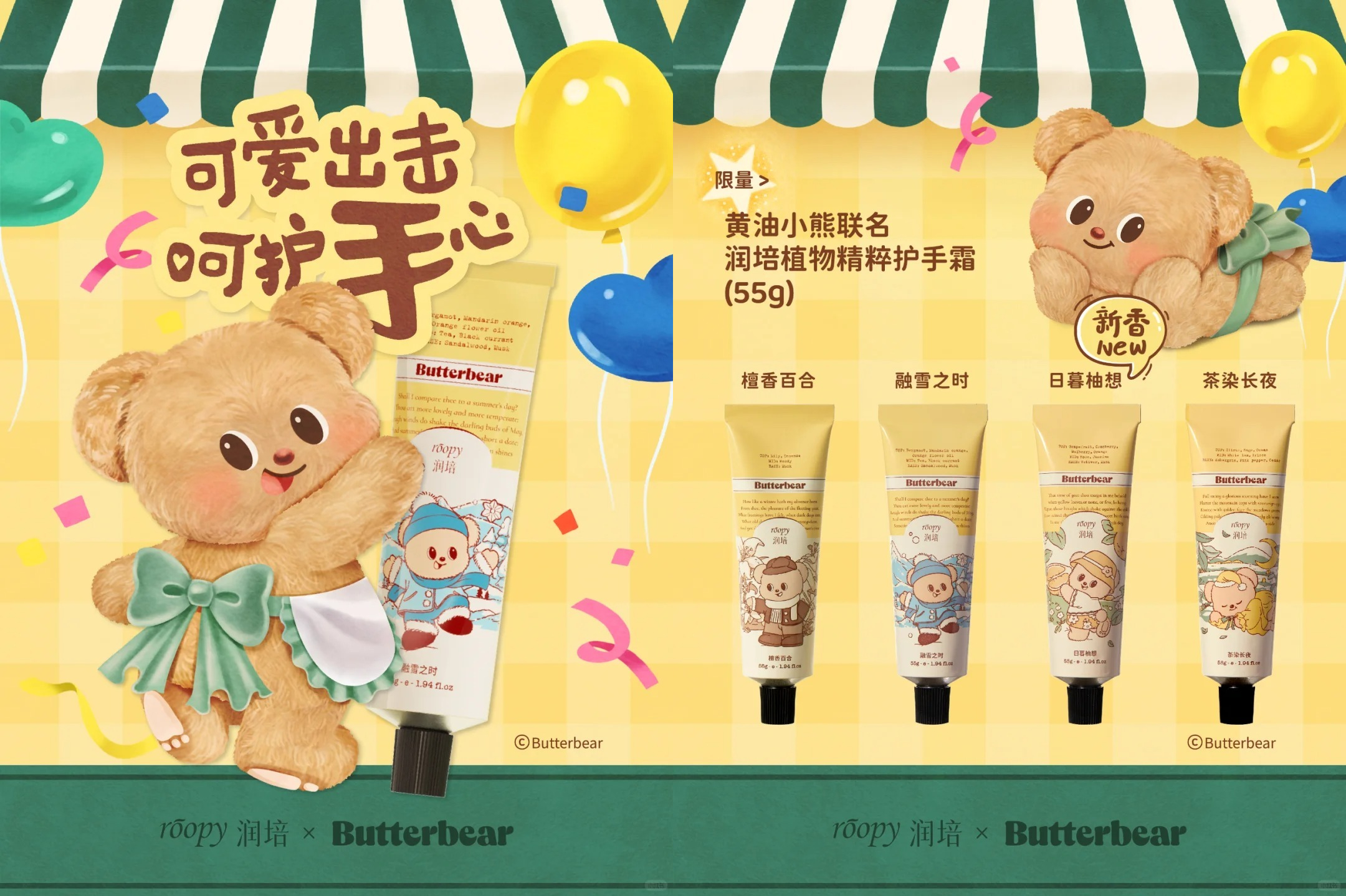 9 月 20 日,国产个护品牌 roopy 润培正式开启与 IP 黄油小熊的惊喜联名。二者将以香氛手霜为联结,一起为生活涂抹新的活力。此次联名将推出推出多款联动护手霜及礼盒,包装内外还将根据黄油小熊及手霜香气进行特别设计与定制,其中「日暮柚想」「夏日遐想」还将作为原创新香首发呈现。不仅如此,购买指定套餐,消费者还将有机会获得贴纸、水杯、帆布袋等联动周边为其妆点可爱世界。推开自由与想象,和小熊一起踏上寻香之旅!
