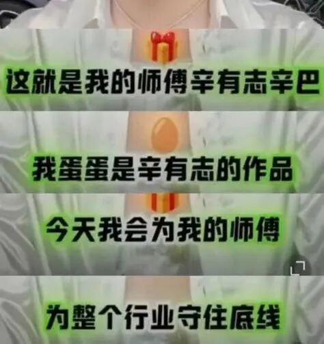 “心里有国家,眼里有大义,这就是我的师父辛有志,他把钱排到了最后,我蛋蛋是辛有志的作品,今天我会为我师父守住整个行业的底线,守住最后的商业价值观,让整个行业更清醒,我代表的不仅仅是我自己,更是无数中国女性,我们女生也可以创造奇迹。”