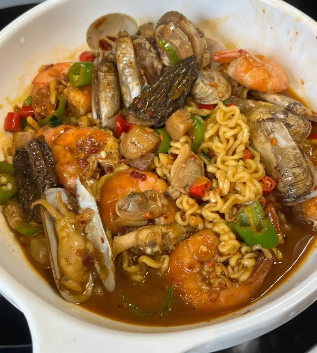 而如今最有钱的博主们已经看不上牛肉了,一袋5块的泡面里先用佛跳墙吊个汤,再用帝王蟹配成佐餐,零星的几根泡面在硕大海鲜旁都成了点缀。