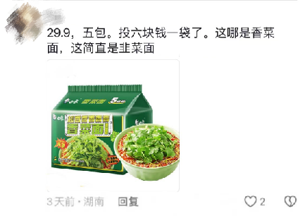 泡面变成概念面,各位老板喜欢的概念都可以塞进来。香菜成为流量秘密后泡面也没逃过被“绿”,只是眼瞅着仅仅是因为变绿就贵了几块的泡面,你怎么看怎么觉得这像是一碗韭菜面。不过在20块一碗只有3片肉的满汉全席泡面面前,香菜们在掏空你口袋时还是保守了。