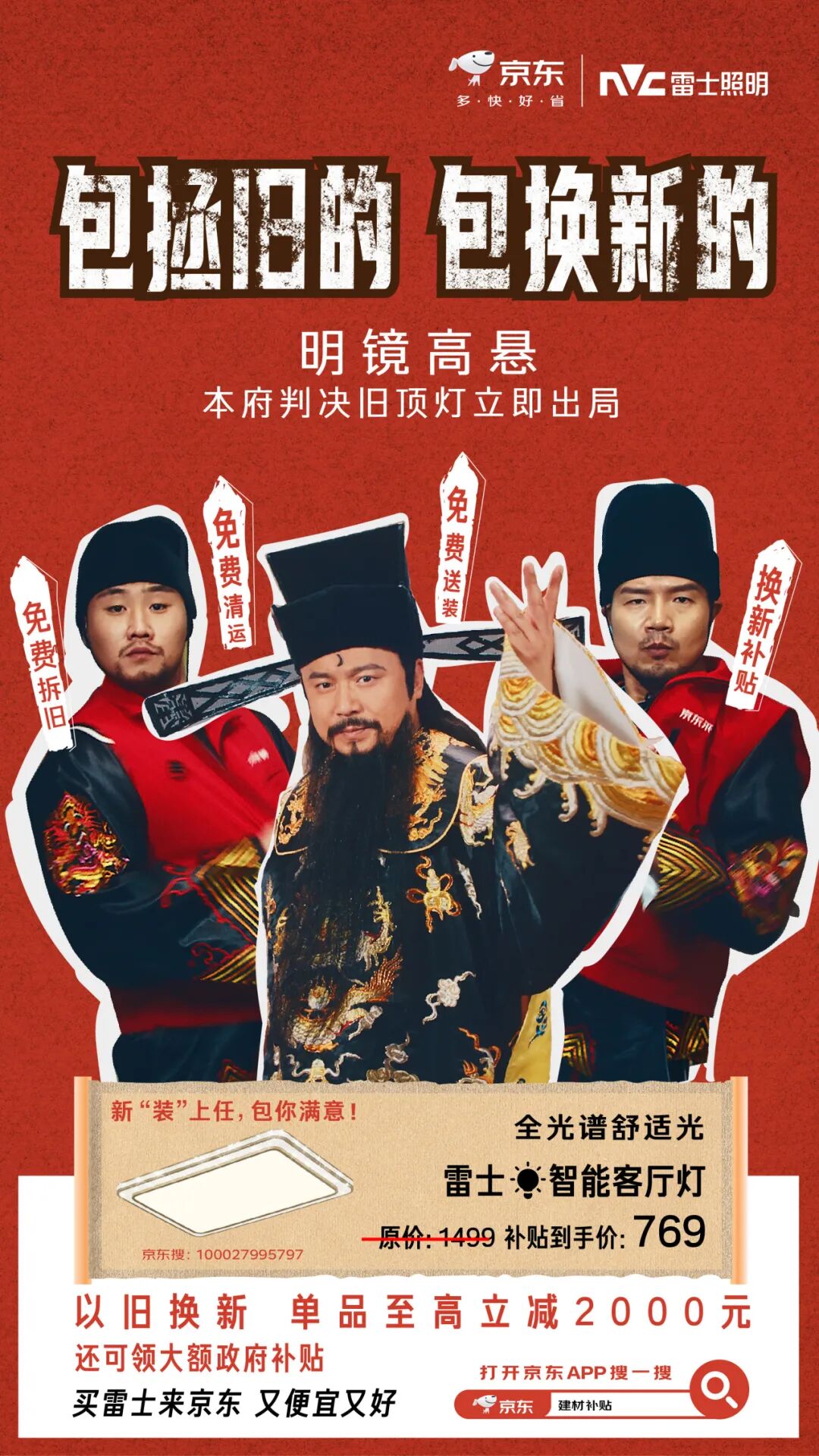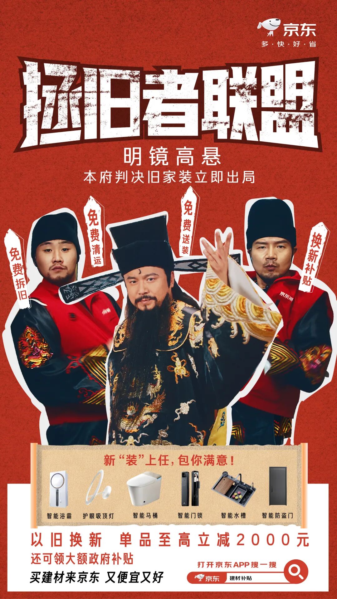 有意思的是,在创意层面,活动主题“拯旧者联盟”谐音“拯救者联盟”,通过一个谐音梗一语双关,一方面巧妙融合“地铁判官”的网络热梗,另一方面和京东家装节“以旧换新”活动结合,创意巧妙。