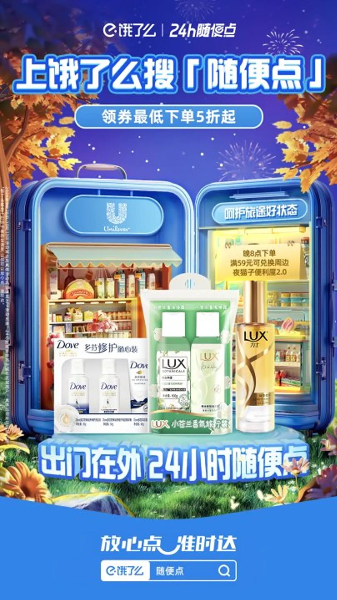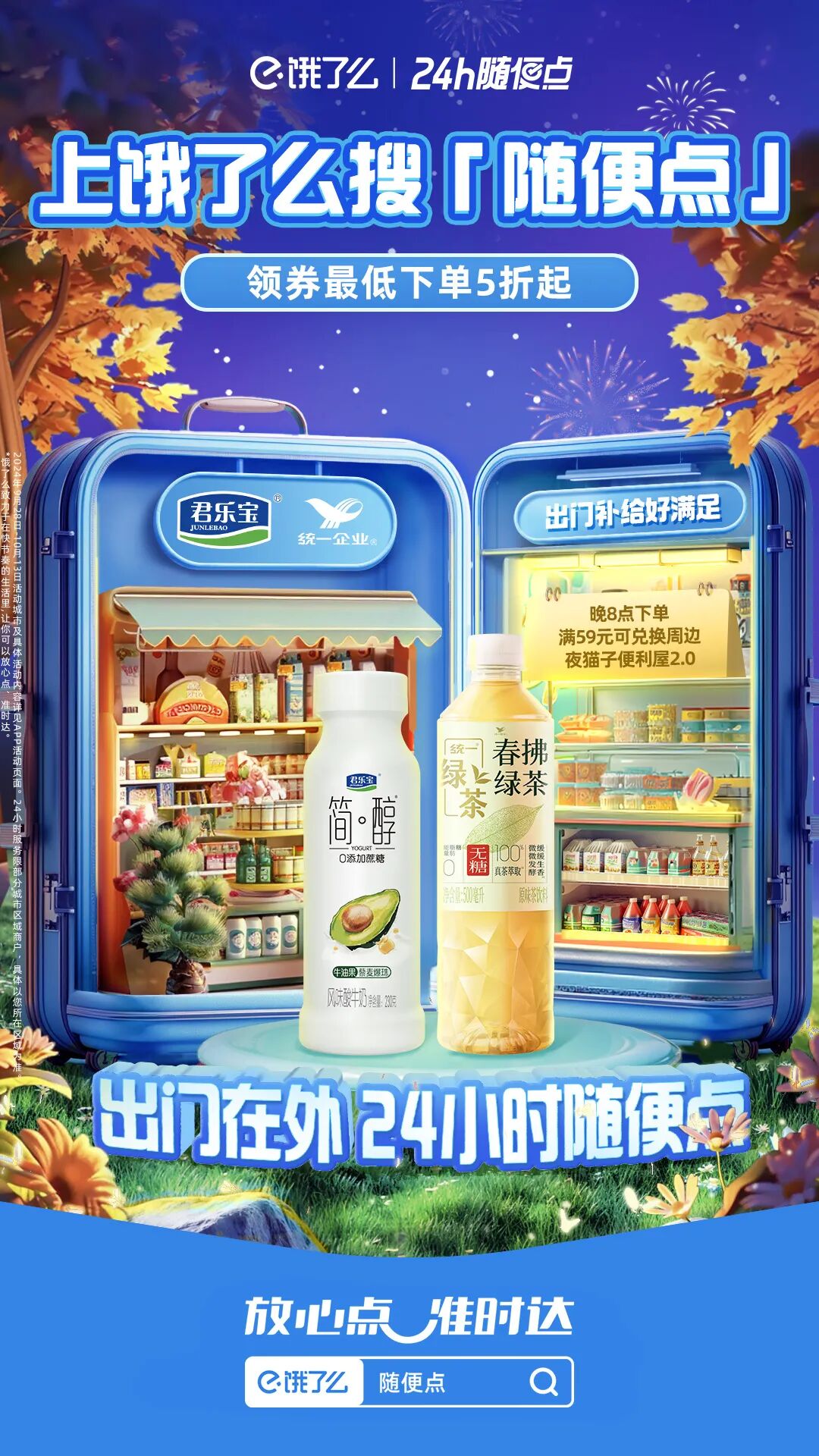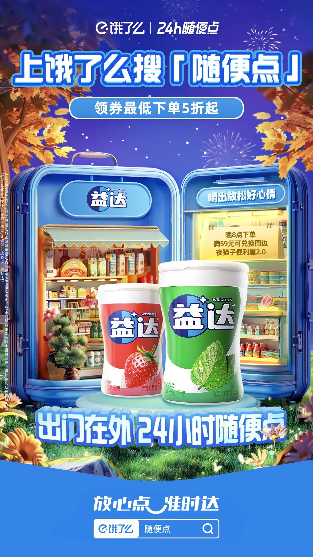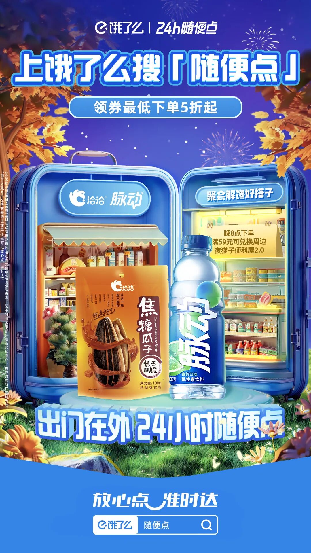 这一次饿了么围绕零售长线IP“24小时随便点”推出第二波福利活动,发掘国庆出游场景发起#上饿了么24小时随便点#主题。