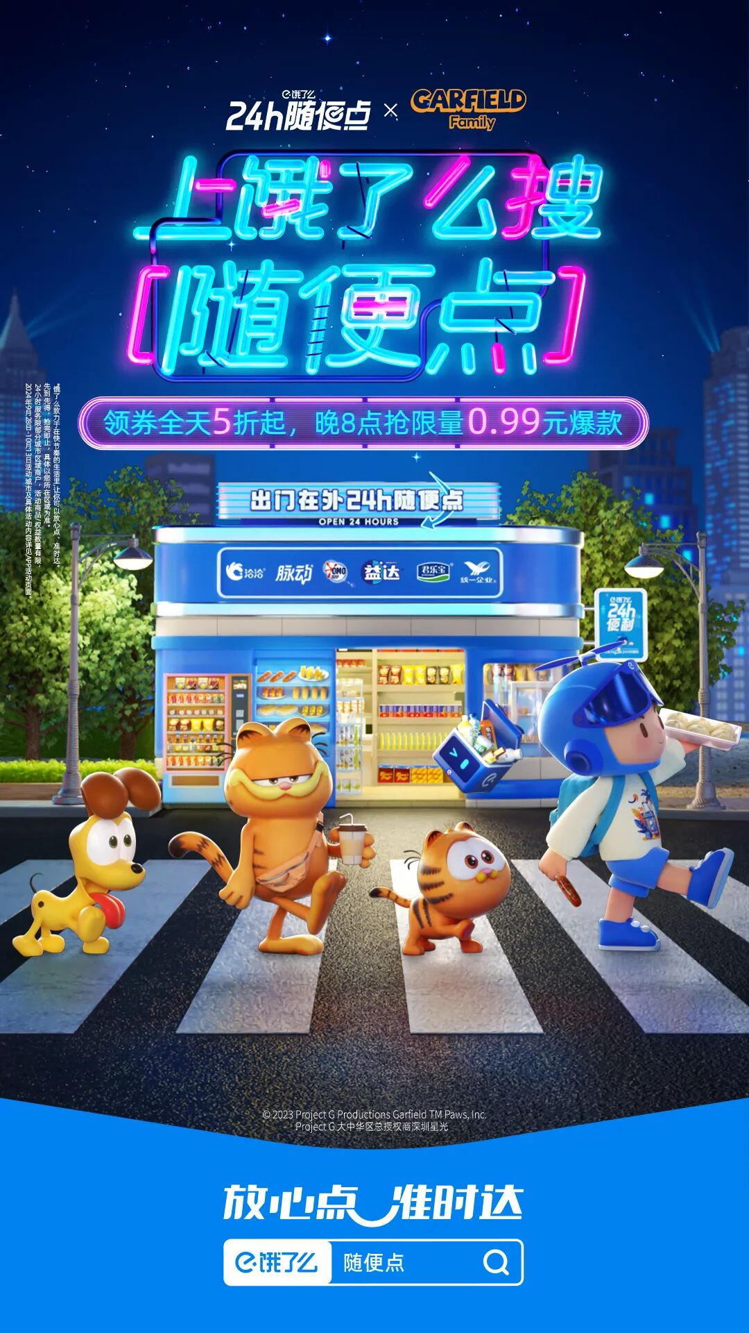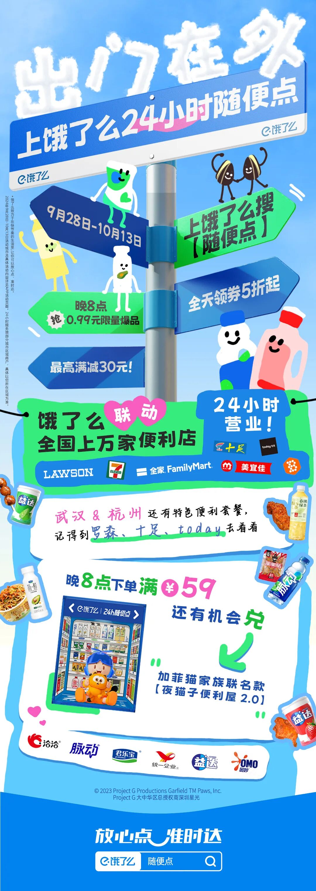 当然找到增量场景后,还需要有落点在活动承接上。饿了么以站内活动利益点为抓手——9月上饿了么搜【随便点】晚8抢0.99元限量爆品。全天领券5折起,最高满减30元。此外,每晚8点开始,下单实付满59元,还有机会兑加菲猫联名款夜猫子便利屋2.0版周边等,做好场景消费的临门一脚。