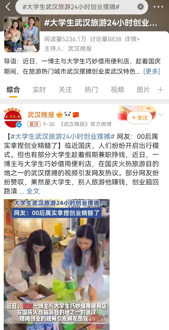 此外,饿了么从微博端发酵武汉同城话题#大学生武汉旅游24小时创业摆摊#,将大众的关注度从大学生摆摊创业,逐步过渡到24小时随便点的平台亮点。