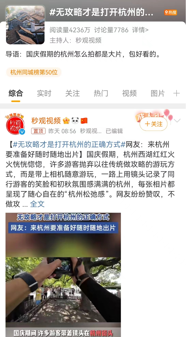 以博主游杭州为素材,饿了么还精选B站博主视频的名场面,进行二次传播,增加杭州无攻略旅游观点的说服力;在微博端,整合B站达人视频内容和杭州摄影合集等传播素材,延伸新话题观点,打造杭州同城热搜#无攻略才是打开杭州的正确方式#,呼应了国庆假期旅游攻略的话题背景。