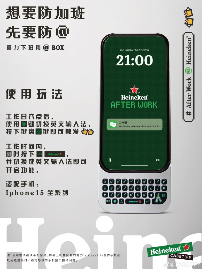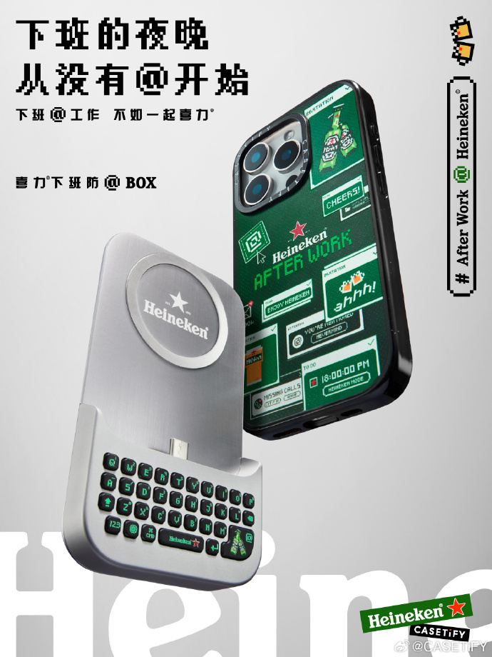 手机壳品牌CASETiFY联合喜力啤酒,推出一款针对iPhone15系列手机的手机壳,拥有一键防@ 功能键盘,让想要艾特的工作通通变成干杯。