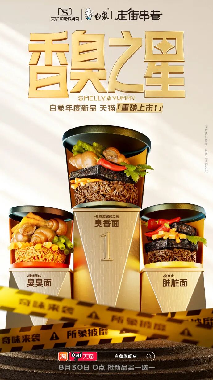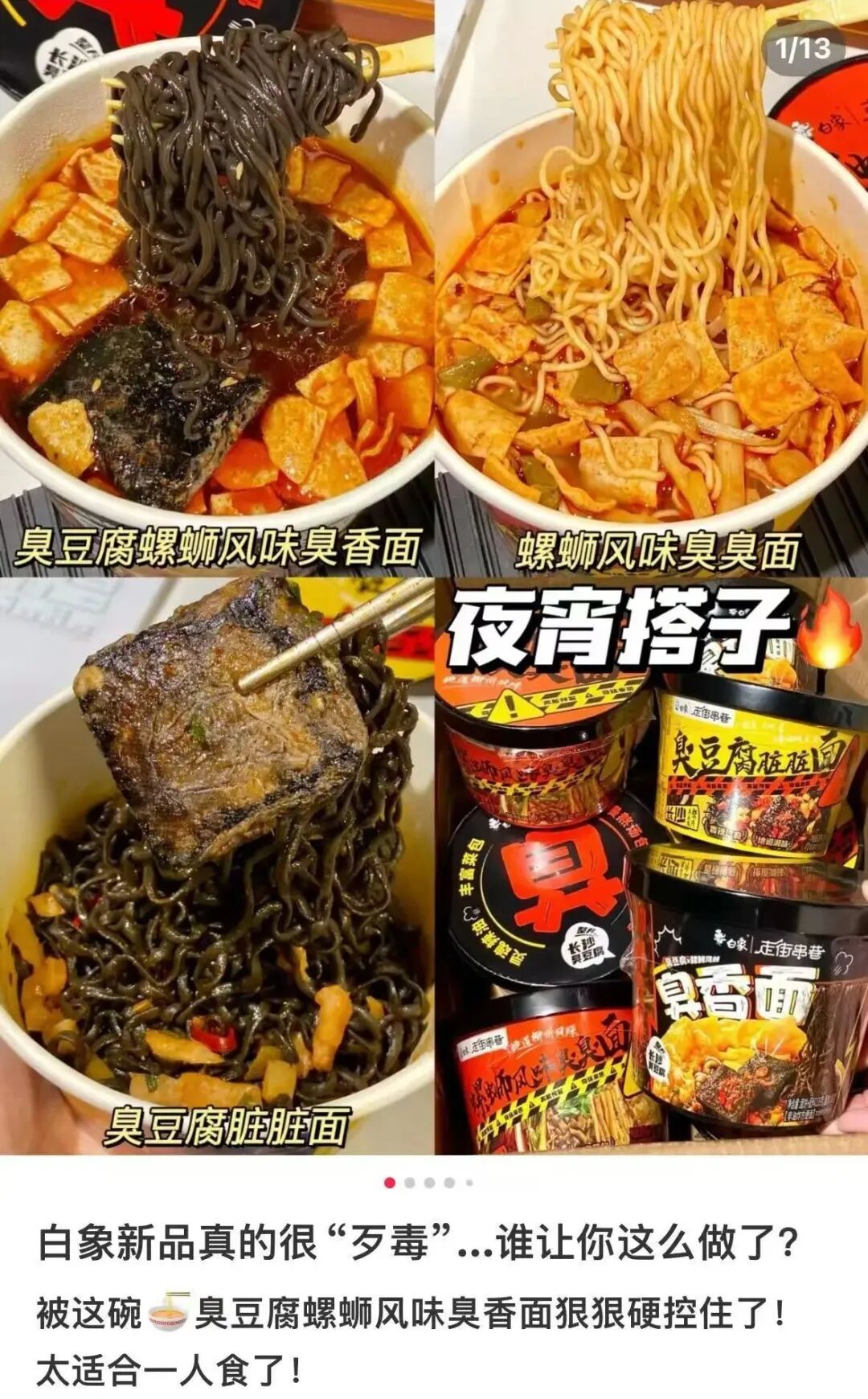 前不久,白象又推出了臭豆腐脏脏面、螺蛳风味臭臭面、臭豆腐螺蛳风味臭香面三种“香臭系”口味,又“脏”又“臭”的白象,成为了不少人新的宵夜搭子。