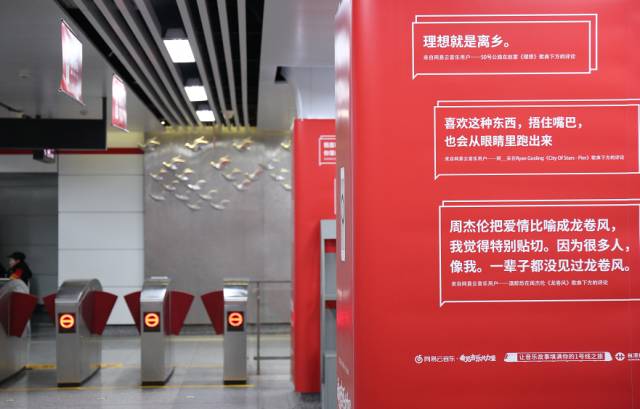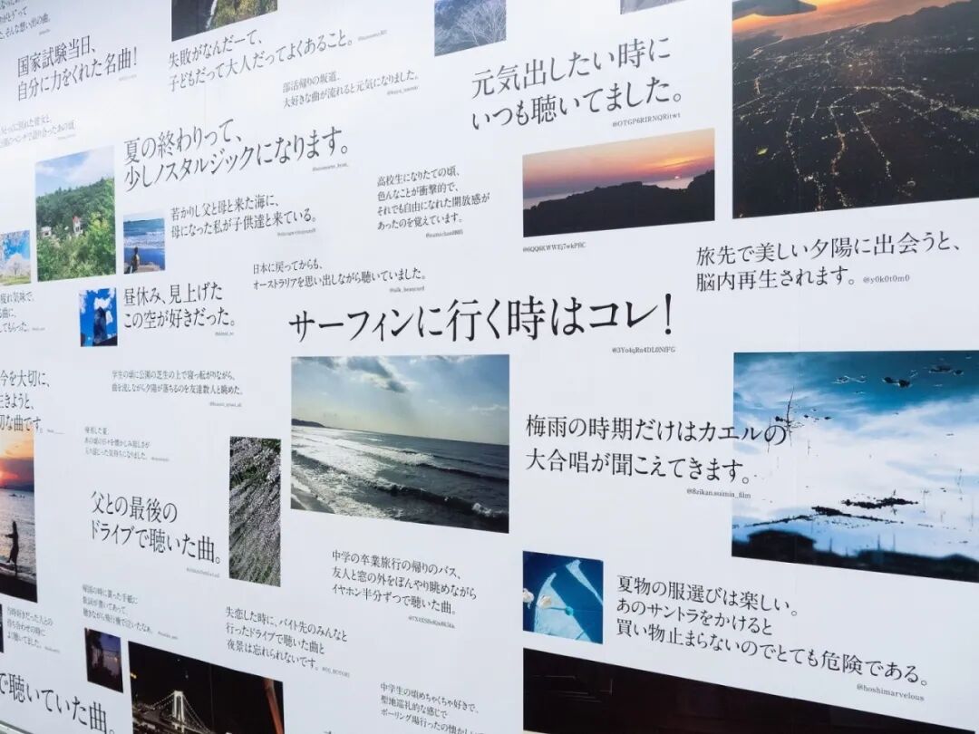 品牌从无数投稿中挑选了 100 首歌曲,让文案和照片上墙。