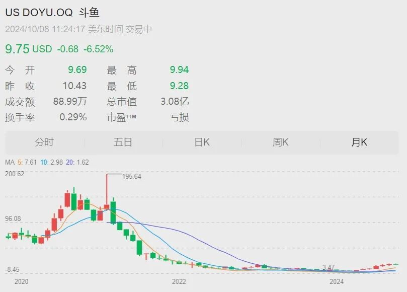 不过,通过分红而带来的股价稳定只是暂时的,在因为分红而导致斗鱼股价攀升之后,接踵而至的则是不断地阴跌。截至10月8日,斗鱼股价报9.75美元/股,距离最高点195.64美元/股,跌去将近90%。