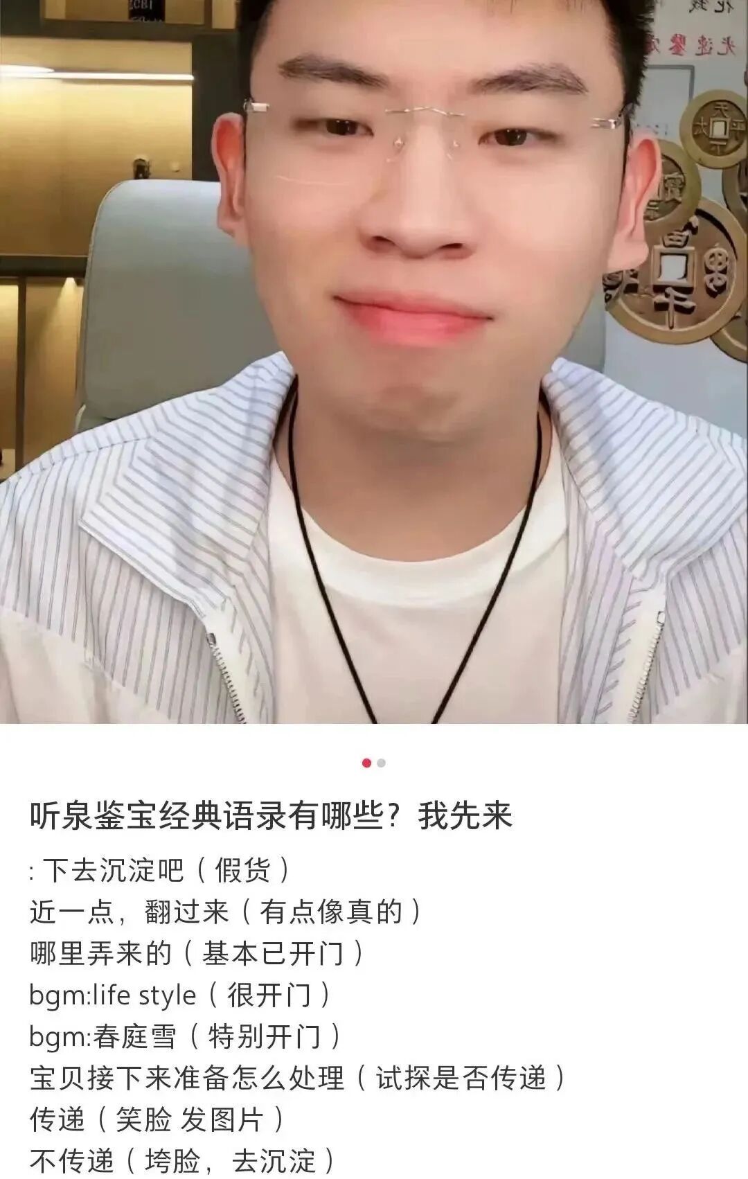 真正喜欢看听泉,是在偶尔刷到的一些切片中,发现跟听泉连麦的一些宝友颇为有实力,比如:还在坑里的摸金校尉、“上周”(商周)在家门口捡到青铜剑的无辜路人、家里藏品堪比博物馆的古董发烧友、偷爹妈宝贝出来变现的富二代、将高仿古董抬至艺术品高度价值在某种程度上远超故宫博物院的巨佬,甚至还有在直播间咨询赃物价值的警察叔叔。