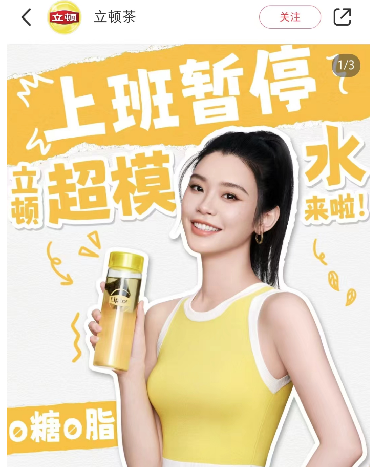 今年4月立顿茶就官宣奚梦瑶为健康生活大使,喊出立顿超模水的口号。