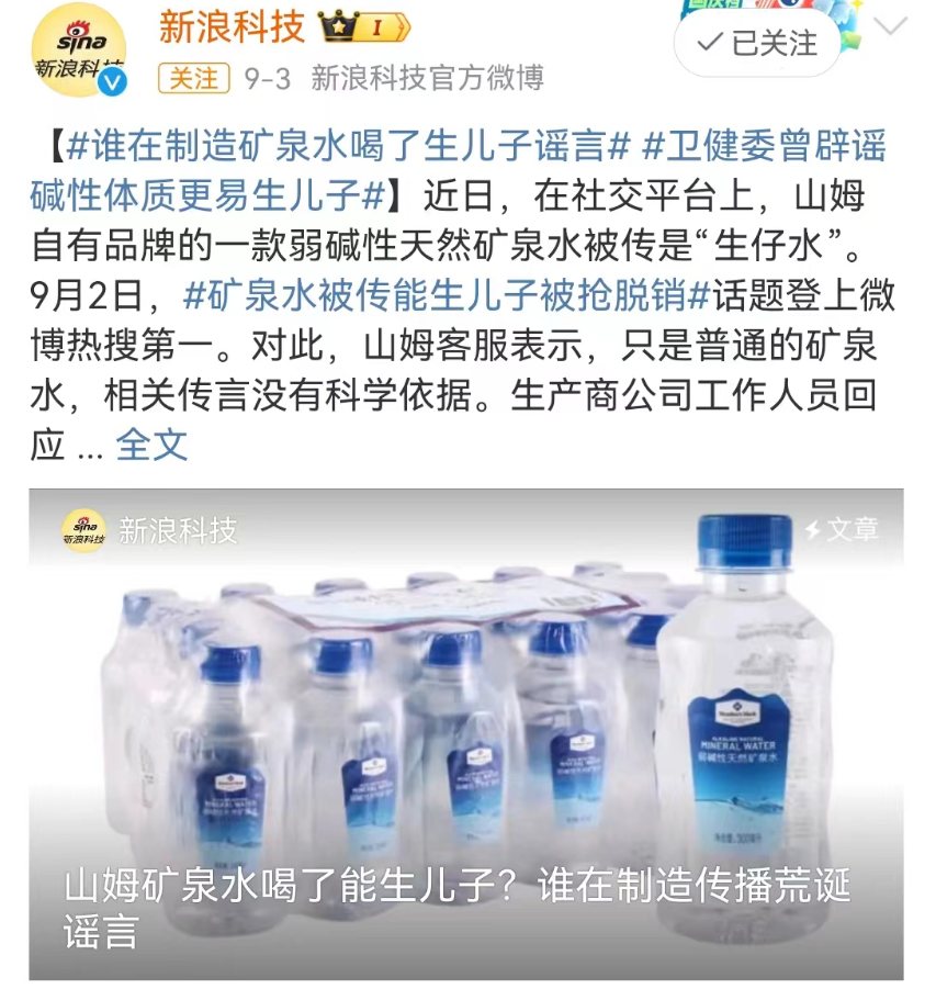 山姆的弱碱性天然矿泉水更加不得了,被传喝了可以生男娃……