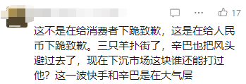 有人讽刺辛巴“不是给消费者下跪致歉,而是在给人民币下跪”。