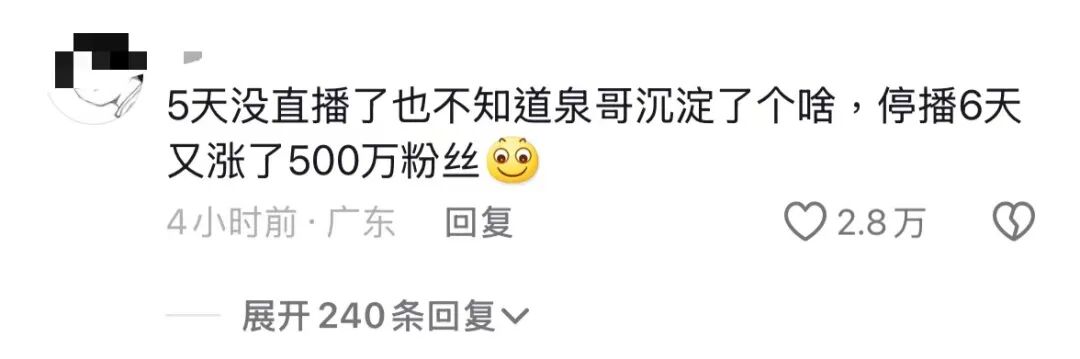 也有粉丝力挺听泉,调侃说道:“5天没直播也不知道泉哥沉淀了个啥,停播6天又涨了500万粉丝”。