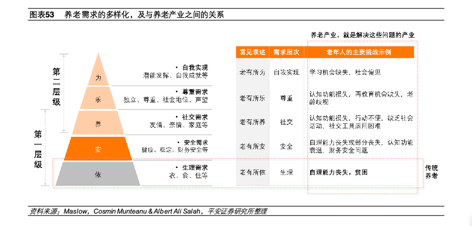 2024年发布的《银发经济系列——千年之变:老龄化时代的养老需求及中国特点》报告显示,老人的养老需求在马斯洛金字塔中不断向上扩张,从基础的生理及安全需求,逐渐拓展到社交、尊重及自我实现需求,呈现多样化和分层扩大化的特征。