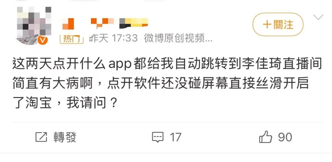就有被李佳琦直播间“误伤”的网友吐槽到:“这两天点开什么app都给我自动跳转到李佳琦直播间简直有大病啊,点开软件还没碰屏幕直接丝滑开后了淘宝,我请问 ?”