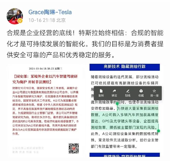 对此,特斯拉对外事务副总裁陶琳回应:合规是企业经营的底线!