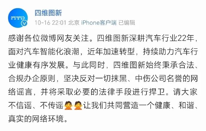 四维图新微博中回应:始终秉承合法、合规办企原则,反对网络谣言,将采取必要的法律手段进行捍卫。