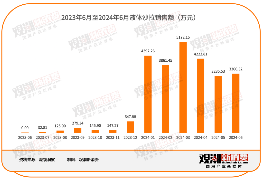 魔镜洞察数据显示,2024年1月淘宝天猫等主流电商平台的液体沙拉销售额同比增长110081723.2%。2024年上半年,液体沙拉的销售额月均达到4000万元以上,上演“狂飙”。