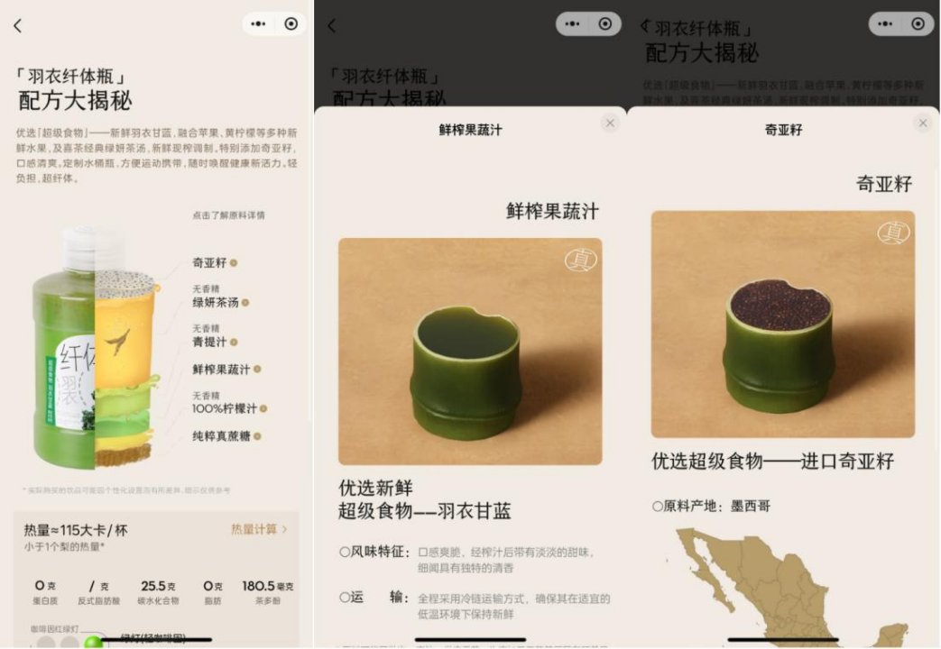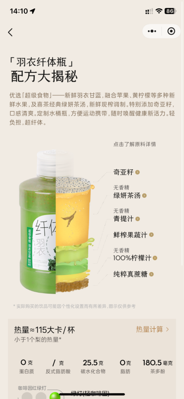 例如,喜茶的羽衣纤体瓶中就含有羽衣甘蓝、奇亚籽,并在配方页面中进行了“超级食物”的标注和说明。