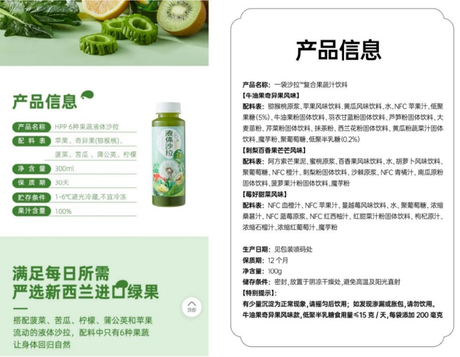 该款液体沙拉采用HPP工艺,在维持蔬果原本颜色、口味和营养成分上表现更好,其配料表也仅有新鲜蔬果,而非羽衣甘蓝粉、NFC果汁等加工产品,配料表更干净。