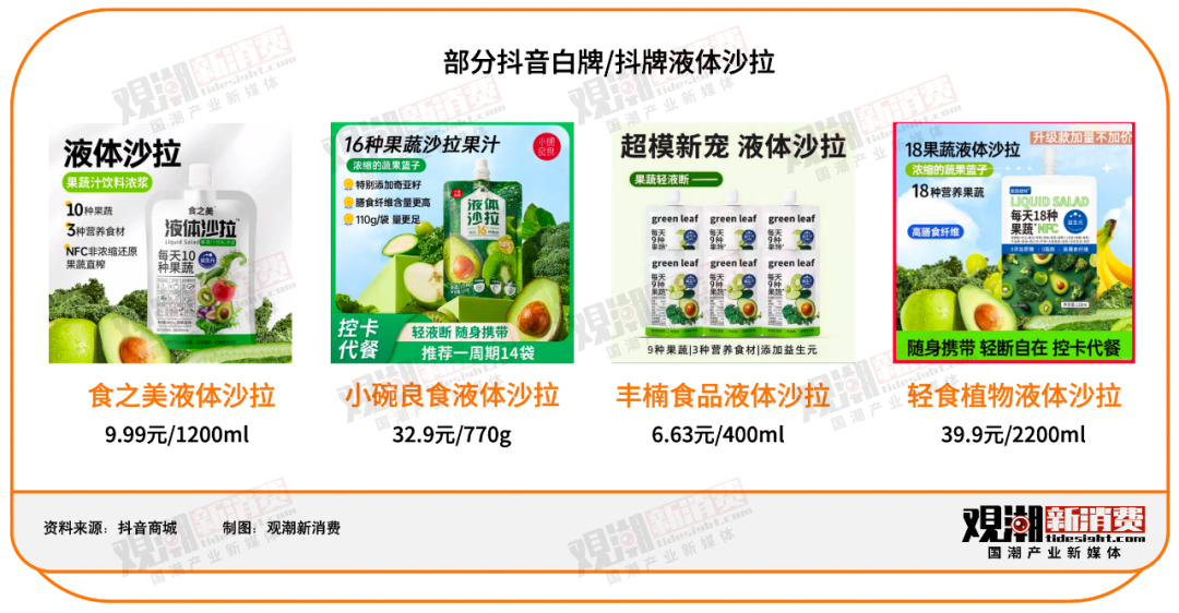 相比之下,抖音上的抖牌或白牌液体沙拉的价格则低了不少,多数仅在个位数范畴,在2.5-5元/300ml这一区间,只有少数品牌在10元区间。
