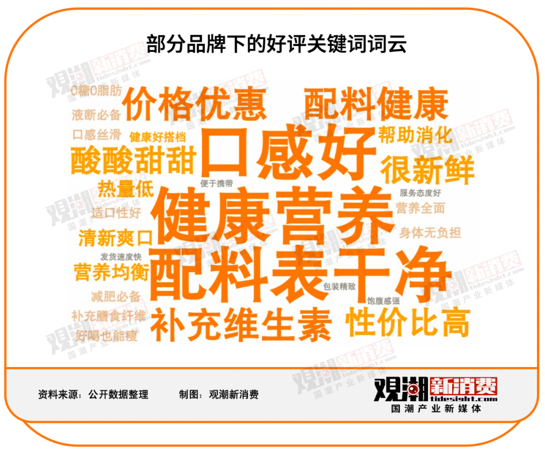 根据观潮新消费对部分品牌店铺内消费者好评的整理分析,口感好、健康营养、配料表干净是液体沙拉被消费者青睐的主要原因。