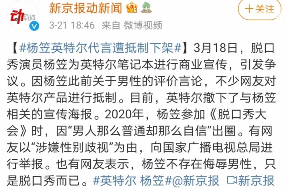 在2021年3月,知名芯片企业英特尔就找到杨笠女士做代言,引发大量男性消费者的不满,英特尔也是像现在这样下架了广告。