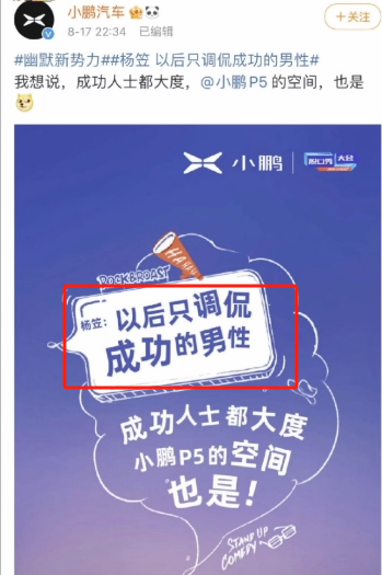然而,就在五个月后,小鹏汽车找了杨笠女士作为代言宣传,并使用杨笠在脱口秀节目称“以后只调侃成功男性”作为品牌宣传语,并附言:成功人士都大度,小鹏P5的空间也是!
