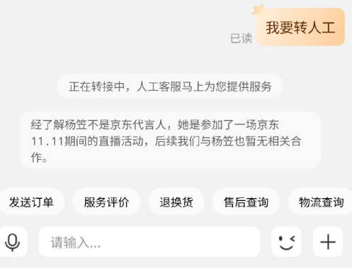而后京东也是默默删去了该条推广微博,就有网友联系京东客服进行退款,京东客服也被大量退款京东会员的阵势逼迫的不得不表态:“杨笠不是京东代言人,她是参加了一场京东11.11期间的直播活动,后续我们与杨笠也暂无相关合作。”